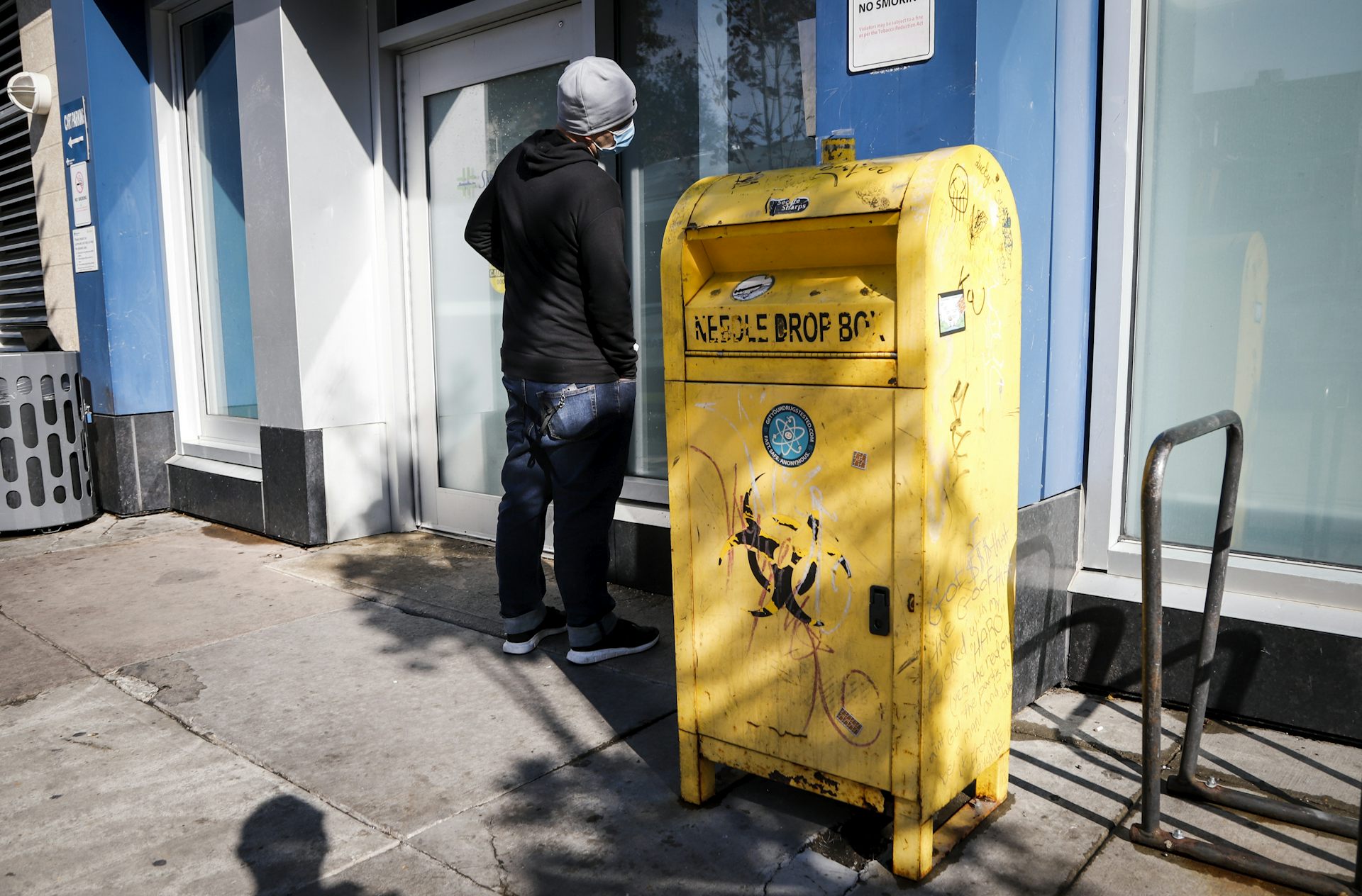 A man waits to enter the Safeworks supervised consumption site at the Sheldon M. Chumir Health Centre in Calgary, Alta., in August 2021.
