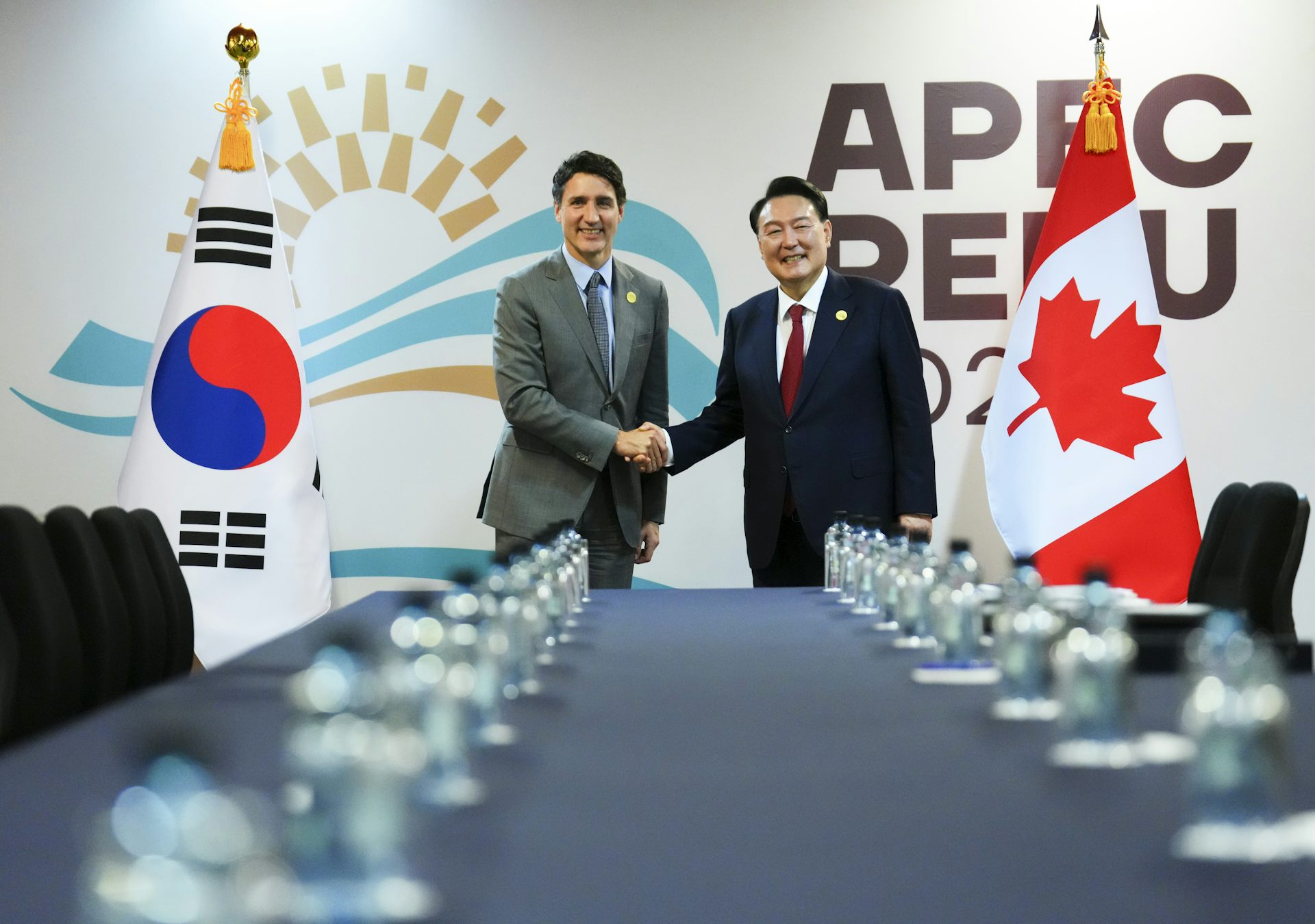 Prime Minister Justin Trudeau meets with South Korean President Yoon Suk Yeol during the APEC summit in Lima, Peru on Nov. 15, 2024.