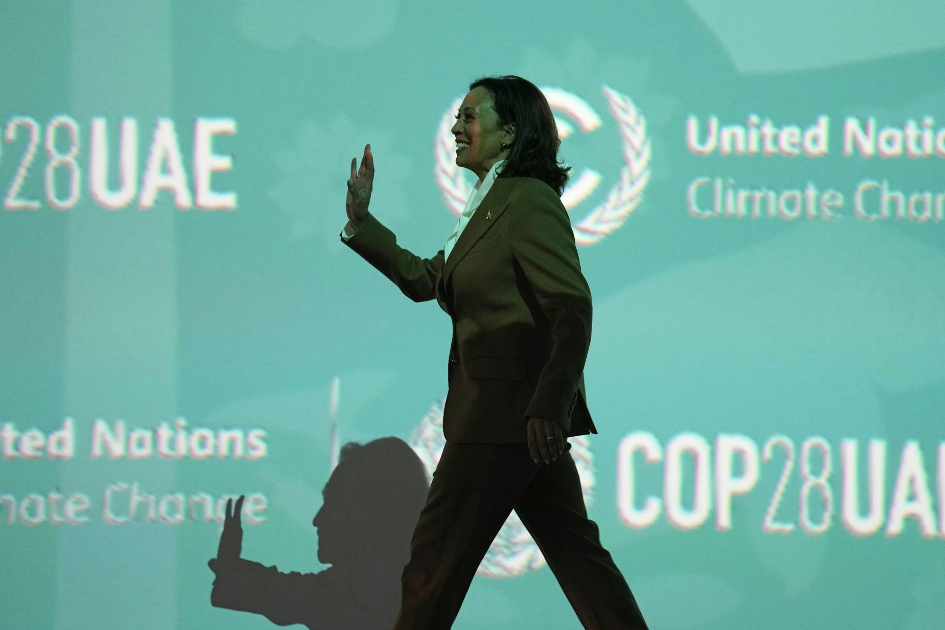Vice President Kamala Harris arrives to speak at the COP28 UN Climate Summit in December 2023. in Dubai, United Arab Emirates. Since she began her run for president, her climate stances have been shrouded in what is likely deliberate ambiguity.