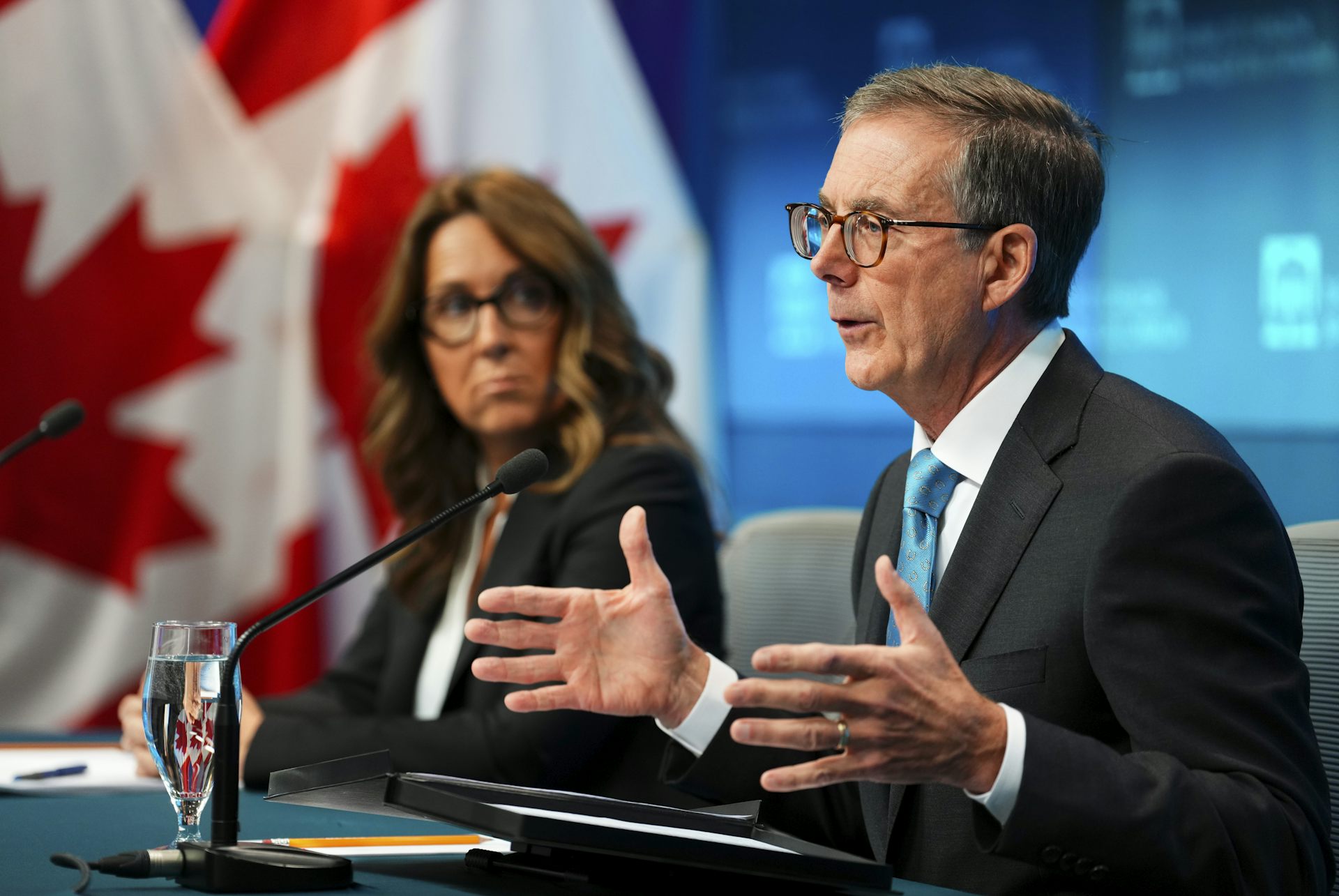 Bank of Canada Governor Tiff Macklem and Senior Deputy Governor Carolyn Rogers hold a press conference at the Bank of Canada in Ottawa on Oct. 23, 2024.