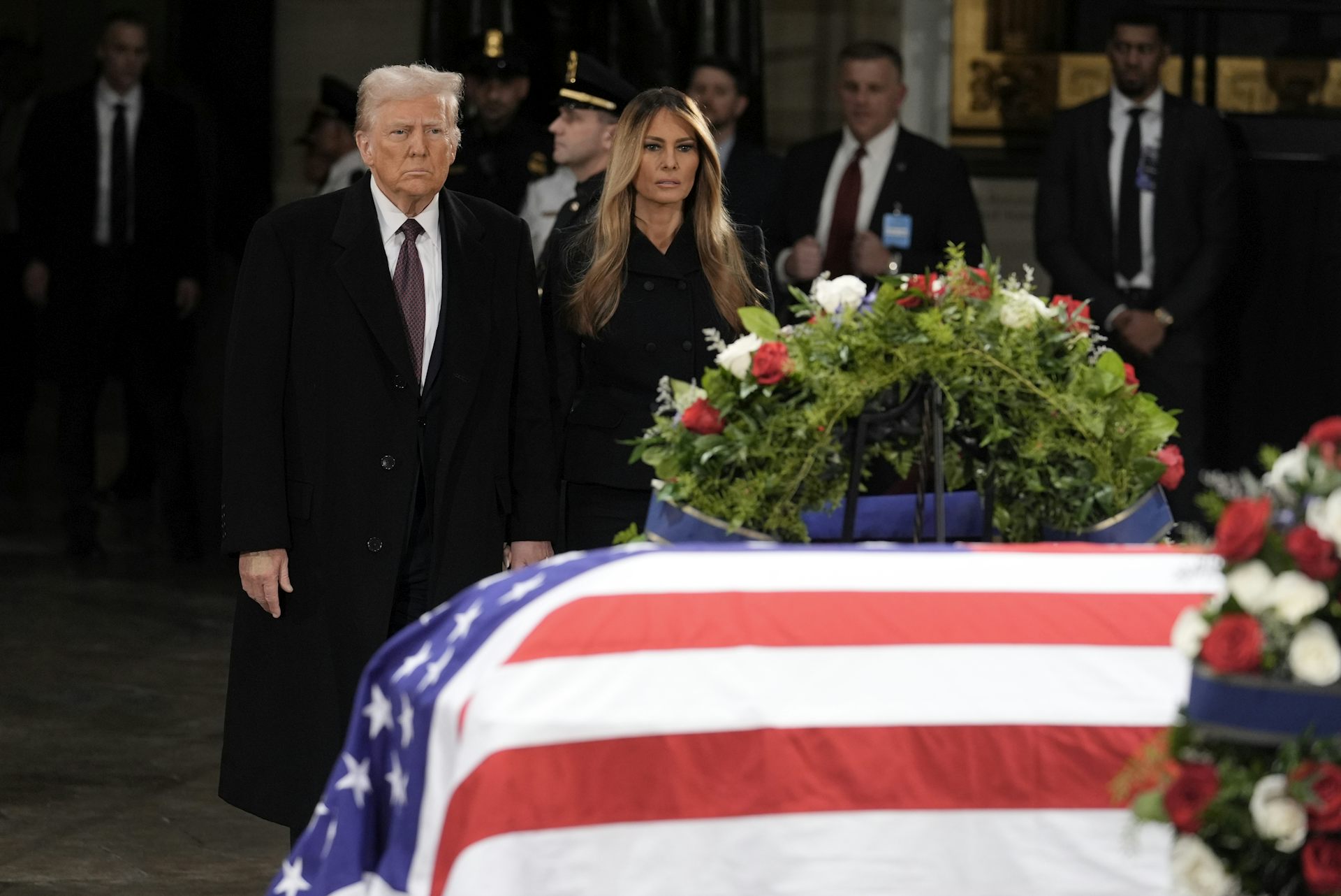 U.S. President-elect Donald Trump and Melania Trump look at the flag-draped casket of former president Jimmy Carter as he lies in state in the rotunda of the U.S. Capitol in Washington, D.C., on Jan. 8, 2025.