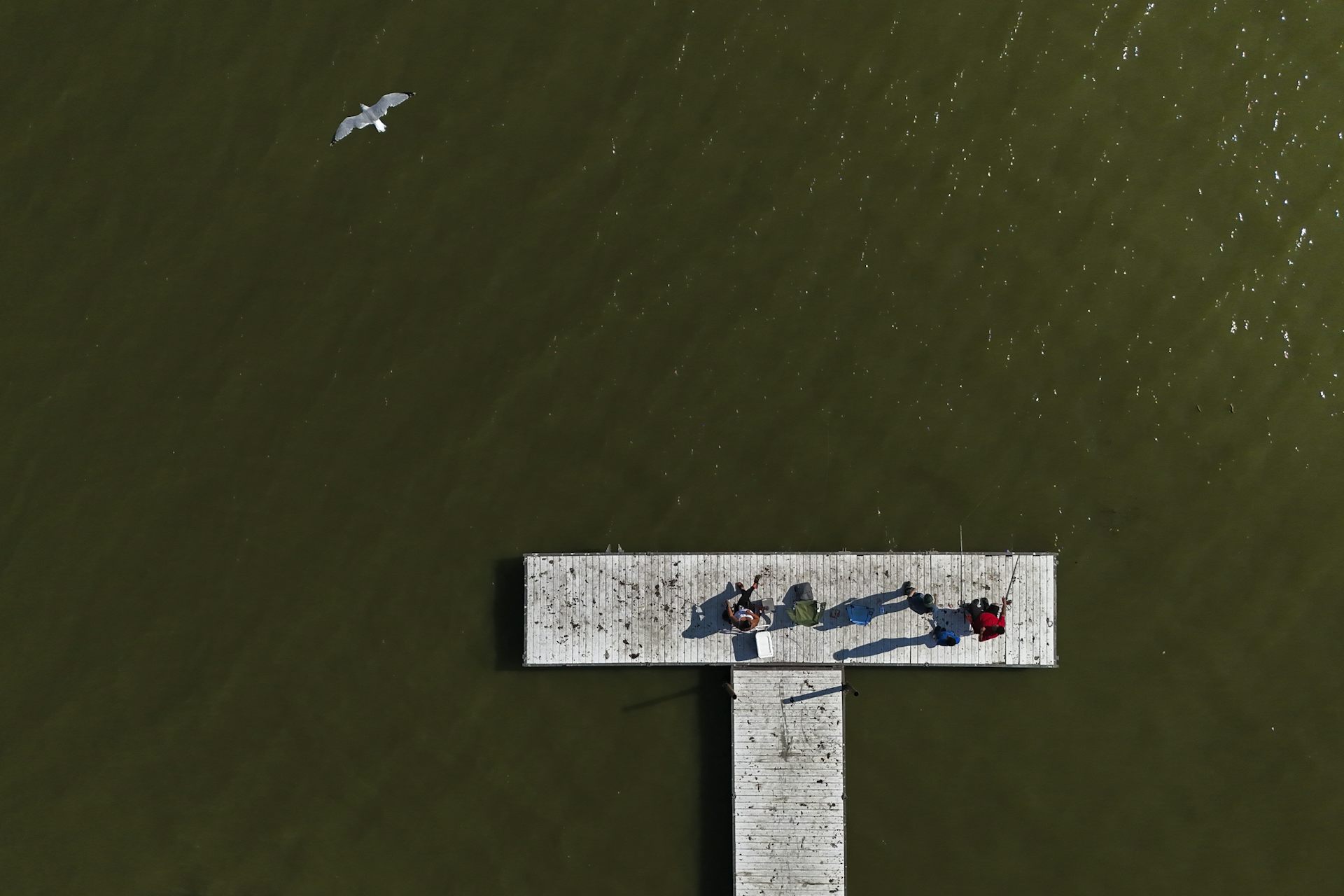 Le 4 septembre 2024,des gens pêchent sur le bord du lac Érié au moment d’une prolifération algale, à Toledo, dans l’Ohio. Les hivers plus chauds entraînent des proliférations plus longues et plus fréquentes.