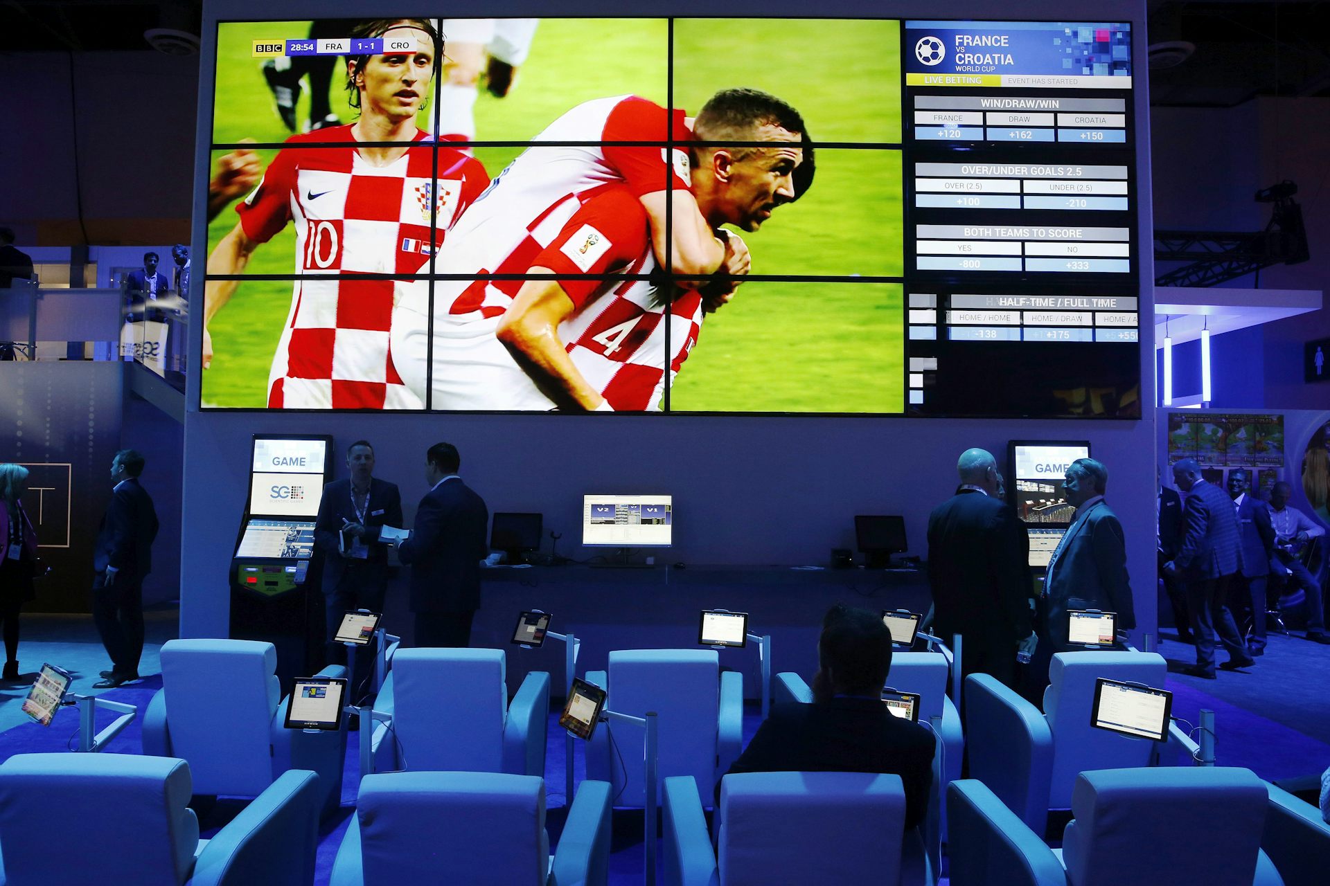 People look at OpenBet sports betting venue products at the Scientific Games booth during the Global Gaming Expo in 2018 in Las Vegas.