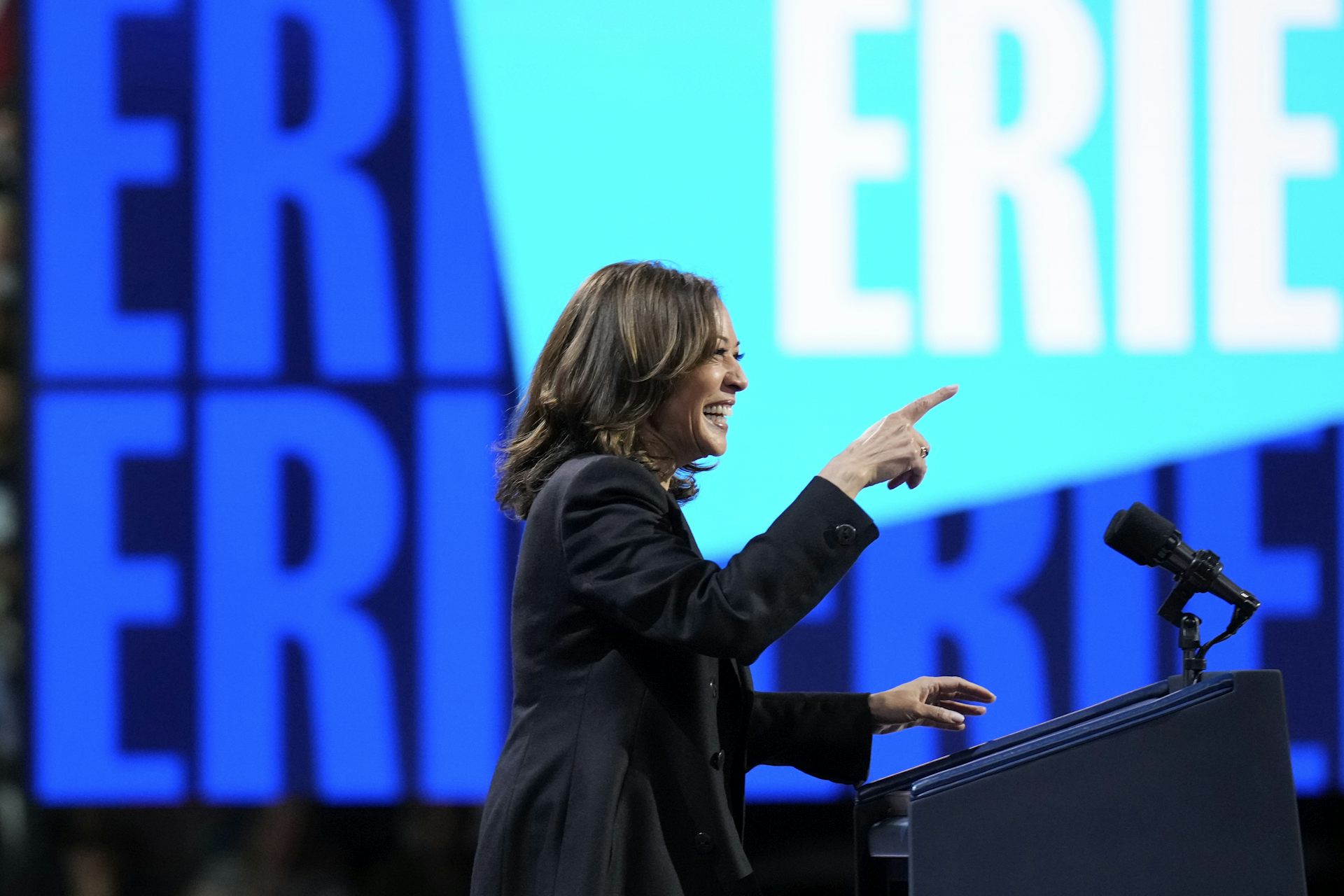 Democratic presidential nominee Vice President Kamala Harris speaks during a campaign rally at Erie Insurance Arena, in Erie, Pa., Oct. 14, 2024.