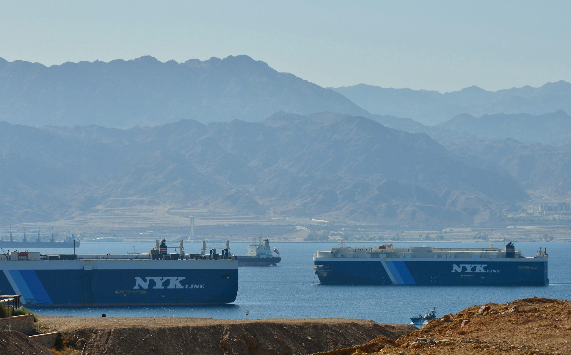 Buques de carga amarrados por cuestiones de seguridad marítima en el golfo de Áqaba, cuyas aguas comunican con el mar Rojo.