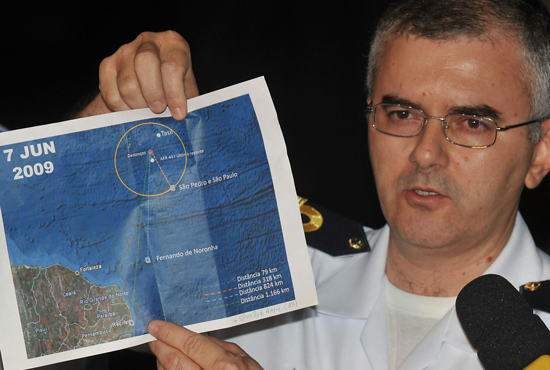 9 de junio de 2009. El capitán de fragata brasileño Giucemar Tabosa Cardoso muestra una imagen de satélite con la localización de los restos del Airbus A330-203 siniestrado.